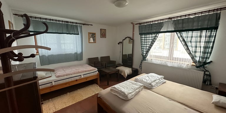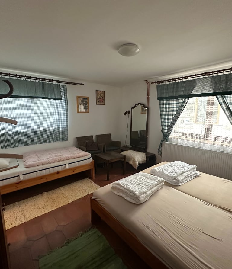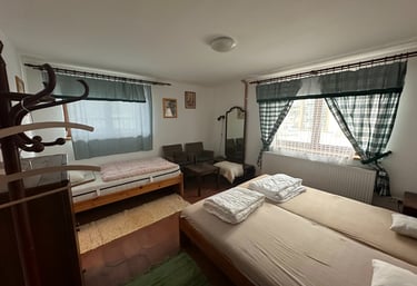 Pohodlné pokoje a apartmány s vlastní koupelnou a WC, celková kapacita až 40 osob.